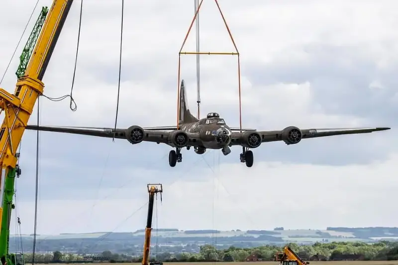 Snímek z natáčení, vidíme zavěšený model bombardéru B-17